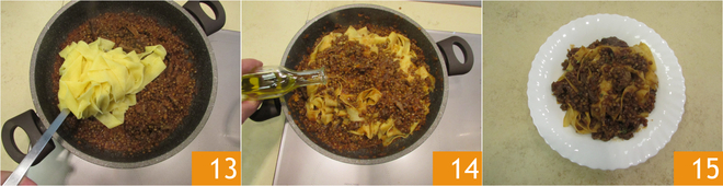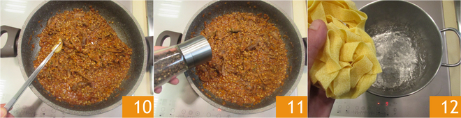 Haal de knoflook er pas uit wanneer de ragù gaar is 10 en breng op smaak met zout en peper 11. Kook de pappardelle 12 in ruim kokend gezouten water.