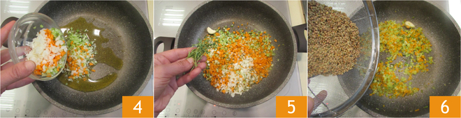 Voeg het fijngesneden mengsel voor de soffritto toe 4, de takjes tijm en de knoflook 5 en laat op matig vuur ongeveer 10 minuten zachtjes kleuren. Spoel intussen de linzen af en voeg ze toe aan de soffritto 6.