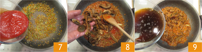 Roer alles door en voeg de passata van tomaat toe 7. Voeg de reeds geweekte en uitgelekte paddenstoelen toe 8, giet ook 100 g van het weekwater erbij nadat je het door een gaasje hebt gefilterd om onzuiverheden te verwijderen 9 en roer opnieuw. Laat circa 40 minuten sudderen. De gaartijden kunnen variëren afhankelijk van het type linzen dat je koopt, daarom adviseren we de instructies op de verpakking te raadplegen en die aan te houden.