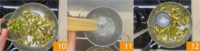 Na een paar minuten voeg je ook de stukjes steel toe 10 en bak je alles op middelhoog vuur ongeveer 10 minuten, tot ze zacht en licht goudbruin zijn. Breng intussen ruim gezouten water aan de kook en kook de linguine beetgaar 11. Voeg tijdens het koken wat pastawater toe aan de artisjokken om ze zachter te laten worden.