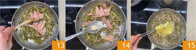 Als de artisjokken zacht zijn, voeg je de uitgelekte en verkruimelde tonijn toe 13. Laat een paar minuten meewarmen en haal dan de teentjes knoflook eruit 14. Giet de pasta af waarbij je een pollepel van het kookwater bewaart en doe de pasta direct in de pan 15.