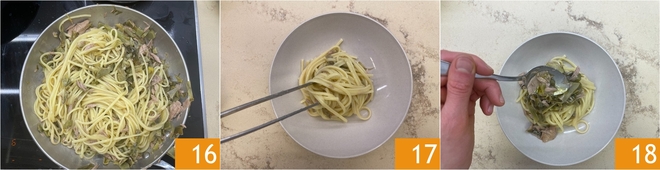 Giet het achtergehouden water erbij om een romige saus te krijgen; breng alles goed op smaak door te schuiven en schep de pasta op 16 en serveer met de saus 17 en het geheel erbij 18.