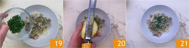 Geef geur met fijngehakte verse peterselie 19 en een rasp van citroenschil 20. Je pasta met artisjokken, tonijn en citroen is klaar om warm geserveerd te worden 21!