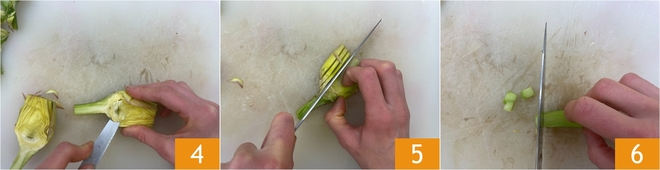 Halveer de artisjokken en verwijder het binnenste pluimpje 4. Snijd vervolgens de bladeren in plakken 5 en snijd de steel in kleine blokjes 6. Bewaar ze in licht zuur water met wat citroensap tot je ze gebruikt, zodat ze niet bruin worden.