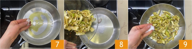Verwarm in een ruime pan de olie met de teentjes knoflook 7. Laat kort op smaak komen en voeg dan de goed uitgelekte artisjokken toe 8, breng op smaak met zout 9 en peper.