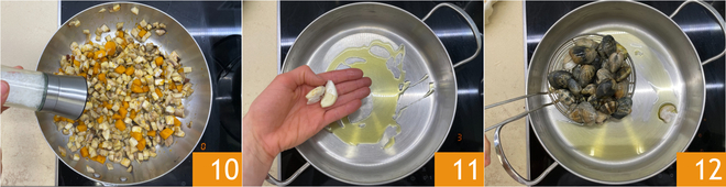 Haal de pan van het vuur, breng op smaak met zout 10 en peper en zet opzij. Nadat de venusschelpen klaar zijn met weken, verhit in een ruime pan een scheutje olie met 2 geplette teentjes knoflook om te aromatiseren 11, voeg dan de venusschelpen toe 12.