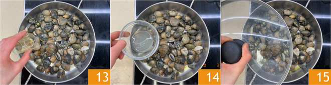 Houd het vuur hoog en blus eerst met de witte wijn 13 en daarna met het citroensap 14. Doe de deksel op de pan 15 en wacht tot ze open gaan.
