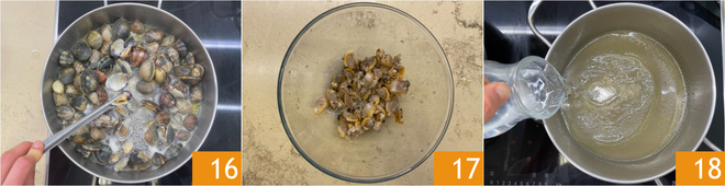Als de venusschelpen open zijn 16, zet je het vuur uit en haal je de schelpdieren uit de schelpen, houd er een paar hele schelpen apart voor het opdienen 17. Zeef het kookvocht in een pan en voeg ongeveer 100 g water toe 18.