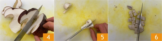 Maak ook de paddenstoelen schoon: snijd de porcini (eekhoorntjesbrood) eerst in plakken 4 en daarna in blokjes van dezelfde grootte als de pompoen. Snijd ook de champignons in stukjes 5 en de oesterzwammen (pleurotus) in stukjes 6.
