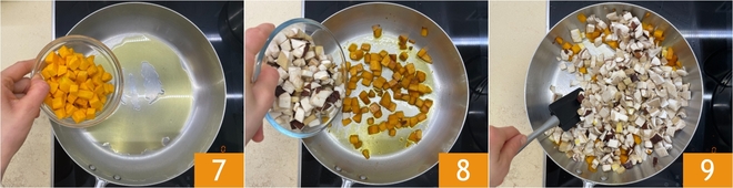 Verhit in een koekenpan een scheutje olie, voeg dan de pompoen toe 7 en bak op hoog vuur ongeveer 10 minuten. Voeg vervolgens ook de paddenstoelen toe 8 en blijf nog 5-7 minuten bakken, regelmatig roerend, totdat de groenten gaar maar nog knapperig zijn.