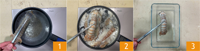 Om de gemengde pasta met mantisgarnalen en garnalenstaarten te bereiden begin je met het koken van de mantisgarnalen: blancheer de hele mantisgarnalen ongeveer 20 seconden in kokend water 1, giet ze daarna af 2 en doe ze in een kom 3.