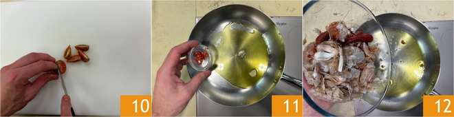 Was de tomaten en snijd ze in partjes 10. Verhit in een pan een scheut olijfolie met knoflook en chilipeper 11. Voeg alle restanten van het schoonmaken van de garnalen en mantisgarnalen toe 12.