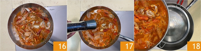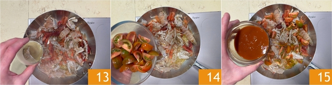 Bak even aan, blus vervolgens met witte wijn 13 en laat de alcohol verdampen. Voeg op dat moment de tomaten en de passata toe 15.