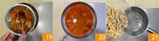Pers de restanten goed uit om het sap te winnen 19. Bewaar het verkregen fonds apart 20 en kook ondertussen de pasta tot de helft van de op de verpakking aangegeven kooktijd 21.