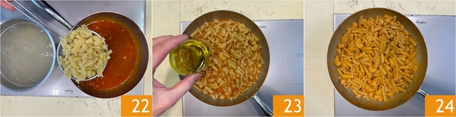 Giet de pasta halverwege de kooktijd rechtstreeks in de pan met het gezeefde fonds 22. Maak de bereiding af, breng het tenslotte op smaak met olijfolie 23 en roer om alles goed te mengen 24.