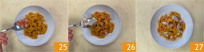 Serveer direct en werk de borden af met de garnalen 25 en de mantisgarnalen 26. De gemengde pasta met mantisgarnalen en garnalenstaarten is klaar om van te genieten 27!