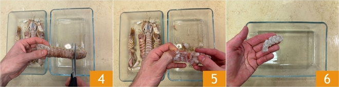 Breek het kopgedeelte los 4 en scheid het pantser van het vlees 5; bewaar de gepelde mantisgarnalen apart 6 en houd de restanten bij.