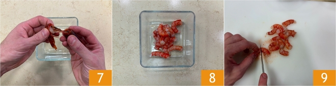 Pel ook de garnalen: breek het kopgedeelte af 7, verwijder het pantser en de darm langs de rug 8, en halveer vervolgens het vlees 9.