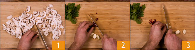 Om de penne all'arrabbiata met champignons te bereiden, moet je de champignons eerst in plakjes snijden 1. Snijd de peperoncino in stukjes 2, pel de knoflook en snijd deze in dunne plakjes 3.