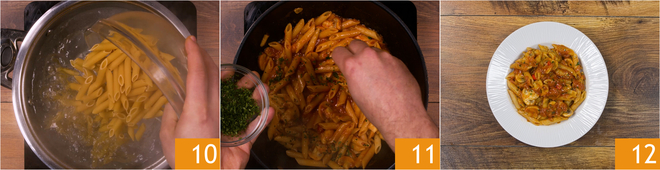 Wanneer het water kookt, voeg je de pasta toe 10 en kook je die al dente. Giet de pasta af en doe hem direct in de pan met saus. Meng goed, voeg de fijngehakte peterselie toe 11 en schep nogmaals om. Serveer de penne all'arrabbiata met champignons direct, goed heet 12.