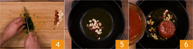 Hak tenslotte ook de peterselie fijn 4. Verhit een flinke scheut extra vergine olijfolie in een vrij ruime pan en voeg de knoflook en peperoncino toe. Laat dit op matig vuur fruiten en let erop dat de knoflook niet verbrandt 5. Voeg de passata toe 6 en laat de saus op een matig vuurtje pruttelen.