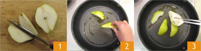 Om peren met speck en gedroogd fruit te maken, was je eerst de peer en snijd hem in 4 parten 1, verwijder daarna het klokhuis. Verhit een scheutje olie in een koekenpan, voeg de perenpartjes toe 2 en bak ze op middelhoog tot hoog vuur aan beide kanten een paar minuten 3. Breng op smaak met zout en peper.