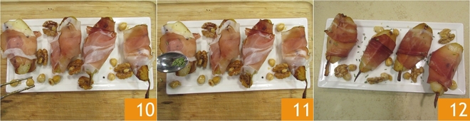 Voeg de honing toe 7 en laat op laag vuur koken terwijl je voortdurend roert. Als de honing volledig is gesmolten, zet je het vuur uit en zet je het opzij 8. Wikkel op dit punt een plakje Speck rondom elk perenpartje 9.