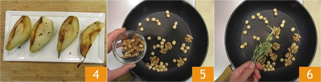 Als ze goudbruin zijn, zet je het vuur uit en leg je de peren opzij, houd ze warm 4. Doe het gemengde gedroogde fruit in een andere pan 5 en voeg de rozemarijn toe 6.
