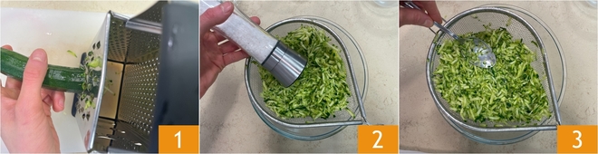 Om de courgettepesto met amandelen te bereiden, was en snijd je eerst de courgettes en rasp je ze met een grove rasp 1. Doe de courgette in een zeef, bestrooi met zout 2 en duw ze met een lepel aan. Laat de courgette 20 minuten rusten om het vrijkomende vocht te verwijderen 3.