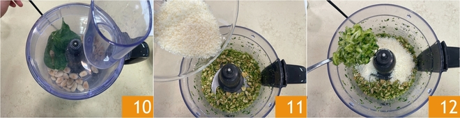 Pureer 10 totdat je een grove textuur krijgt. Voeg nu de geraspte Parmigiano Reggiano toe 11 en de uitgelekte courgette 12.