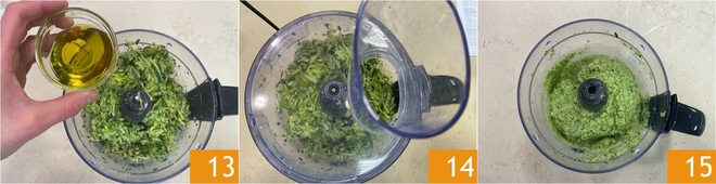 Giet de extra vergine olijfolie erbij 13 en zet de mixer nog een paar seconden aan 14. Je moet een rustieke maar egale structuur bereiken 15.