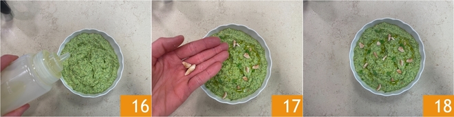 Maak de pesto af met een scheut extra vergine olijfolie 16 en de apart gehouden amandelen 17. Jouw courgettepesto met amandelen is klaar om geserveerd te worden 18!
