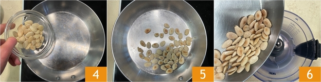 Verhit ondertussen in een droge pan de gepelde amandelen 4 en rooster ze op middelhoog vuur gedurende ongeveer 7 minuten, regelmatig roerend zodat ze niet verbranden 5. Doe de geroosterde amandelen in een blender of mixer met messen 6 en houd er een paar apart voor de garnering.