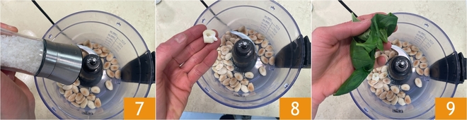 Voeg het zout toe 7, het teentje knoflook, gepeld en zonder het kiempje 8, en de verse basilicum 9.