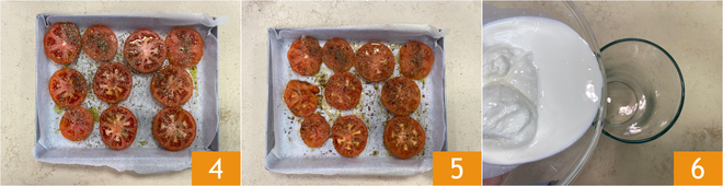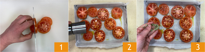 Om de pinsa met geroosterde tomaten, burrata en gekookte ham te maken, begin je met de tomaten. Nadat je ze gewassen en gedroogd hebt, snijd je ze in plakken van 1 cm dik 1. Leg ze op een met bakpapier beklede bakplaat en breng op smaak met olie, zout, peper 2 en daarna oregano 3.