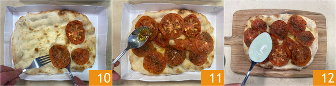 Leg de pinsabodem op een bakplaat met bakpapier, beleg met de geroosterde tomaten 10 en met het vocht dat ze hebben achtergelaten 11. Bak 5 minuten in de oven, opnieuw op 220°, haal hem eruit en leg op een snijplank. Bestrijk vervolgens met de burratasaus 12.