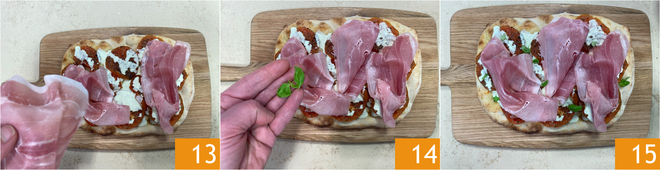 Garneer met de plakjes gekookte ham 13 en de blaadjes basilicum 14 en voilà, je pinsa met geroosterde tomaten, burrata en gekookte ham is klaar 15.
