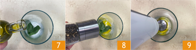 Voeg basilicumblaadjes, olie 7, zout en peper 8 toe en pureer alles; zet opzij 9.