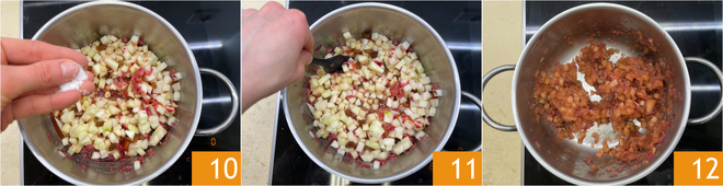 Breng op smaak met zout 10, roer goed door 11 en zet het zachtjes verder op laag vuur ongeveer een uur, of totdat het chutney uit elkaar valt en ingedikt is 12. Laat iets afkoelen.