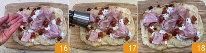 Garneer tenslotte met tijm 16 en zwarte peper 17. Je pinsa met mortadella en burrata is klaar om te genieten 18!