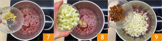 Voeg op dit punt de geraspte gember toe 7, de in blokjes gesneden appels 8 en de rozijnen 9.