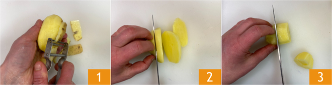 Om de pinsa met salsiccia en aardappels te maken, begin je met de aardappels: schil ze 1 en snijd ze eerst in plakken 2 en daarna in blokjes van ongeveer 1,5 cm 3.