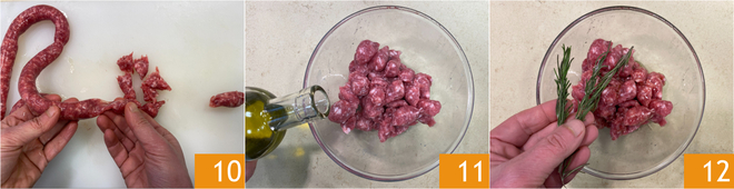 Maak ondertussen de salsiccia klaar: verwijder het omhulsel en scheur de worst met je handen in stukjes van ongeveer 2 cm 10. Doe de salsiccia in een kom en meng met olie 11 en rozemarijn 12.