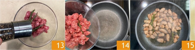 Breng licht op smaak met zout, maal er peper over 13 en meng goed. Verhit een anti-aanbakpan goed en voeg dan de salsiccia toe 14 en bak deze in ongeveer 5 minuten goudbruin, haal daarna van het vuur en zet apart 15.