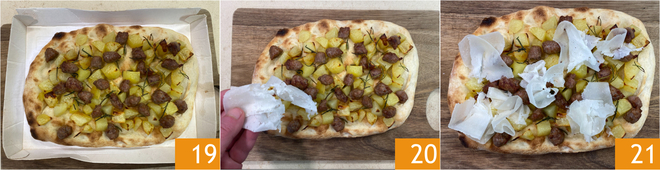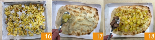 Als de baktijd voorbij is, haal je de aardappels uit de oven 16. Neem nu de pinsabodems en verdeel de geroosterde aardappels over het oppervlak 17, voeg dan ook de gebakken salsiccia toe 18.