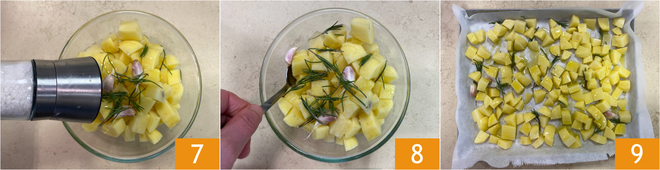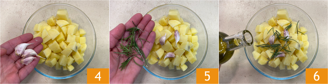 Doe de aardappelblokjes in een kom en breng ze daarna op smaak met de ongeschilde teentjes knoflook 4, de takjes rozemarijn 5 en de olie 6.
