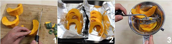 Om de pompoen gnocchi op Romeinse wijze te bereiden, snijd de pompoen eerst, verwijder de zaden en de schil 1 en leg deze op een bakplaat gewikkeld in aluminiumfolie 2. Bak op 200 graden gedurende 40 minuten. Zodra deze klaar is, laat je hem afkoelen en pureer je hem met een pureeknijper 3 om een puree te verkrijgen die je apart houdt.