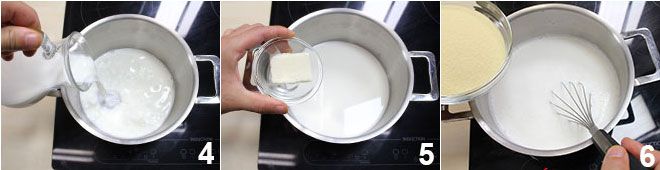 Ga verder met het deeg voor de gnocchi op Romeinse wijze: doe de melk in een steelpan 4 met 40 gram van de in totaal 80 gram boter 5 en verwarm op matig vuur. Voeg zout en nootmuskaat toe, en zodra de melk begint te koken, voeg je de griesmeel in een dunne straal toe, terwijl je krachtig roert met een garde om klontjes te voorkomen 6. Zet het vuur lager om te voorkomen dat de bodem verbrandt. Kook het geheel al roerend met een garde 3-4 minuten, totdat het een homogeen mengsel vormt en het griesmeel is ingedikt.