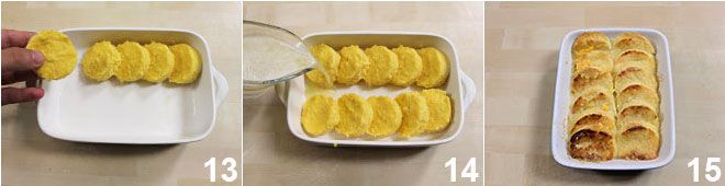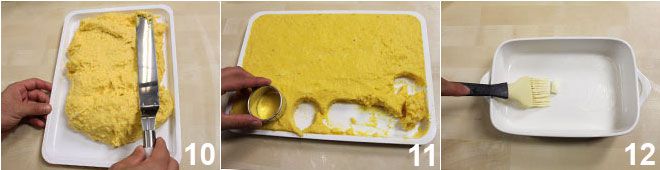 Breng het mengsel over op een licht vochtige schaal met lage randen en smeer het mengsel uit tot een laag van 1 cm met behulp van een spatel 10. Wacht ongeveer 5 minuten tot het gnocchi-mengsel is afgekoeld en steek met een uitsteekvorm van 5 cm ronde pompoen gnocchi uit 11. Boter een ovenschaal in 12 en