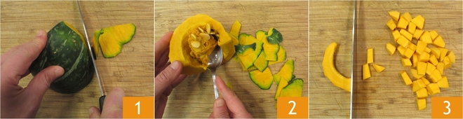 Om de croccantella met pompoen te maken, maak je eerst de pompoen schoon: verwijder de schil 1, haal de zaden en draden eruit 2 en snijd 250 g vruchtvlees in blokjes 3.